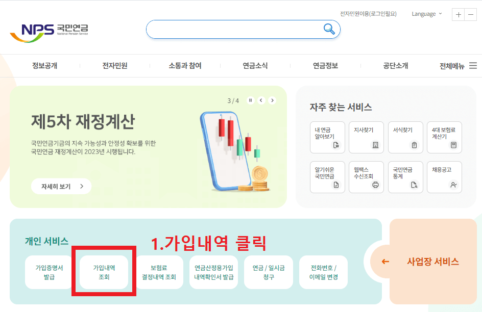 로그인후 아래 가입내역조회로 나의 국민연금 납입 조회를 바로 확인합니다