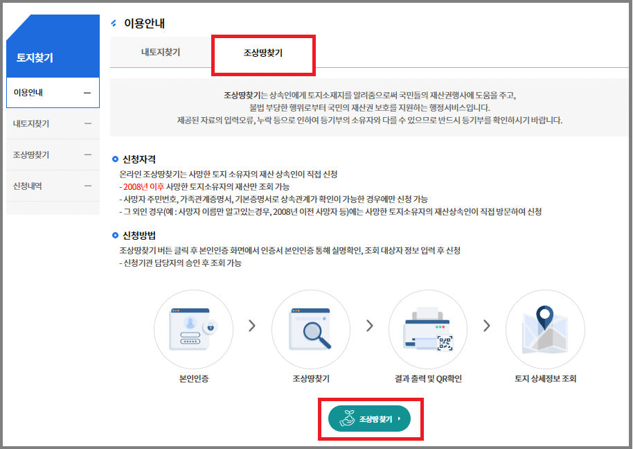 [온라인 조상땅찾기]는 2008.1.1. 이후 사망한 부모, 배우자, 자녀의 토지 찾기 서비스로 사망인(조회대상자) 기준 기본증명서에 사망일자가 표기되어야 하고, 가족관계증명서로 사망인과 신청인의 가족관계 확인이 가능한 경우에만 신청할 수 있습니다.